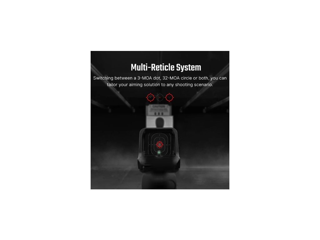 Multiosnovový systém - S možností přepínání mezi osnovou 3 MOA tečka + 32 MOA kruh, pouze tečkou nebo pouze kruhem si můžete přizpůsobit míření pro jakoukoli střeleckou situaci.